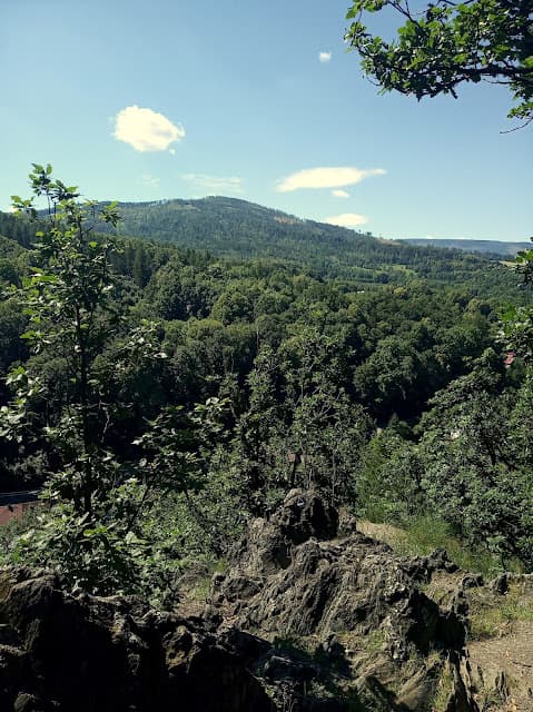 Grupa tych skał jest świetnym punktem widokowym na Biskupią Kopę i Jarnołtówek. Zapewne dawniej miejsce to oferowało jeszcze szerszą panoramę, dziś jest nieco zarośnięte. Niestety na biegowym treningu, podczas którego powstały dwa poniższe zdjęcia, miałam do dyspozycji tylko telefon, ale uwierzcie, warto się na te skałki wdrapać.