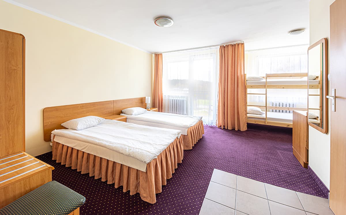 Pokoje 4 osobowe Znajdują się w budynku głównym. Wyposażone są w łóżka oddzielne i łóżka piętrowe. W każdym pokoju znajduje się łazienka z prysznicem, biurko, TV, dostęp do WI-FI, część pokoi posiada balkony. Pokoje 3 osobowe Znajdują się w budynku głównym. Wyposażone są w 3 łóżka oddzielne i rozkładaną kanapę. W każdym pokoju znajduje się łazienka z prysznicem, biurko, TV, dostęp do WI-FI, część pokoi posiada balkony. Pokoje studio Pokoje znajdują się w budynku letnim. Wyposażone są w łóżka oddzielne i łóżka piętrowe. . W każdym pokoju znajduje się łazienka z prysznicem, aneks kuchenny, TV, dostęp do WI-FI i balkon.