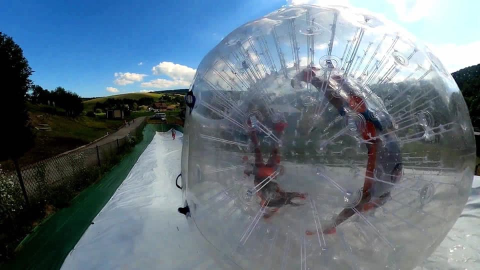 Zakręcona zabawa. polega na staczaniu się po specjalnie przygotowanym torze w ogromnej 3 -3,5m kuli (mamy kilka). We wspomnianej kuli zamknięta jest druga 2 metrowa a przestrzeń pomiędzy nimi wypełniona jest powietrzem oraz systemem wzmocnień. Posiadamy trzy Kule zrobione z bardzo wytrzymałego, przeźroczystego materiału TPU. Kule są dwu osobowe a uczestnicy zapięci są w pasy leżąc w kuli naprzeciwko siebie. Możliwa jest również zabawa po płaskiej powierzchni (chodzenie, pokonywanie slalomu, itp.) Na terenie OWS Andrzejówka, mamy unikatowy usypany z ziemi tor o długości ok 50m